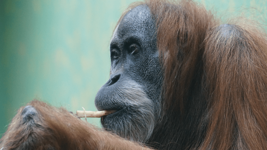The orangutan takes a long deep breath, looks left then right, his plate-shaped face blinking, chin raised, mouth closed. Endangered. An iconoclast.