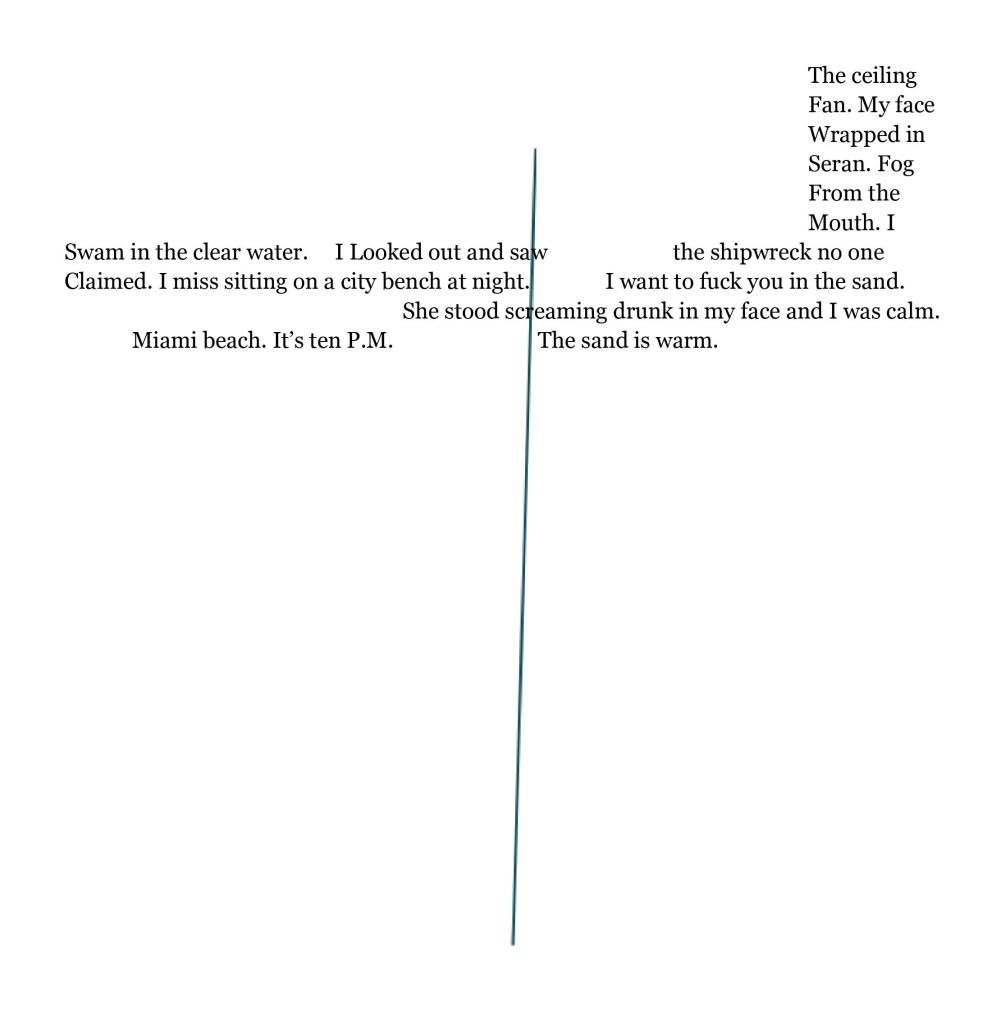 This was years ago. God stopped speaking from the sky and admitted that there are actually many gods and they all shared the job of the voice of god. It got complicated; they could never agree on anything. Nowadays they ride the bus or go to the mall. They talk too loudly. Voicing their little opinions, all the authority drained out. They’ve become lazy and forgetful. They get distracted by nice weather or their own fingernails. If someone is hogging a public restroom it’s probably them, primping in the mirror when you really need to go. They are vain but there is something sweet there. Maybe because they have no money, or that they aspire to an ideal of love. One time a god came running out of the kitchen to bring me a smoothie but spilled the whole thing on the carpet. The small god started crying, little tears on her cheeks. A glittery river of snot running from her nose. It’s okay, I told her–I’m not mad. She gets upset about storms, too. The darkening sky, how the birds all get quiet. There’s nothing to be scared of, I say. And we sit by the window and take everything in. We listen to the rain on the house, we count between the thunder and the lightning, and we sip the smoothies we remade together because she wanted another chance to make me happy.